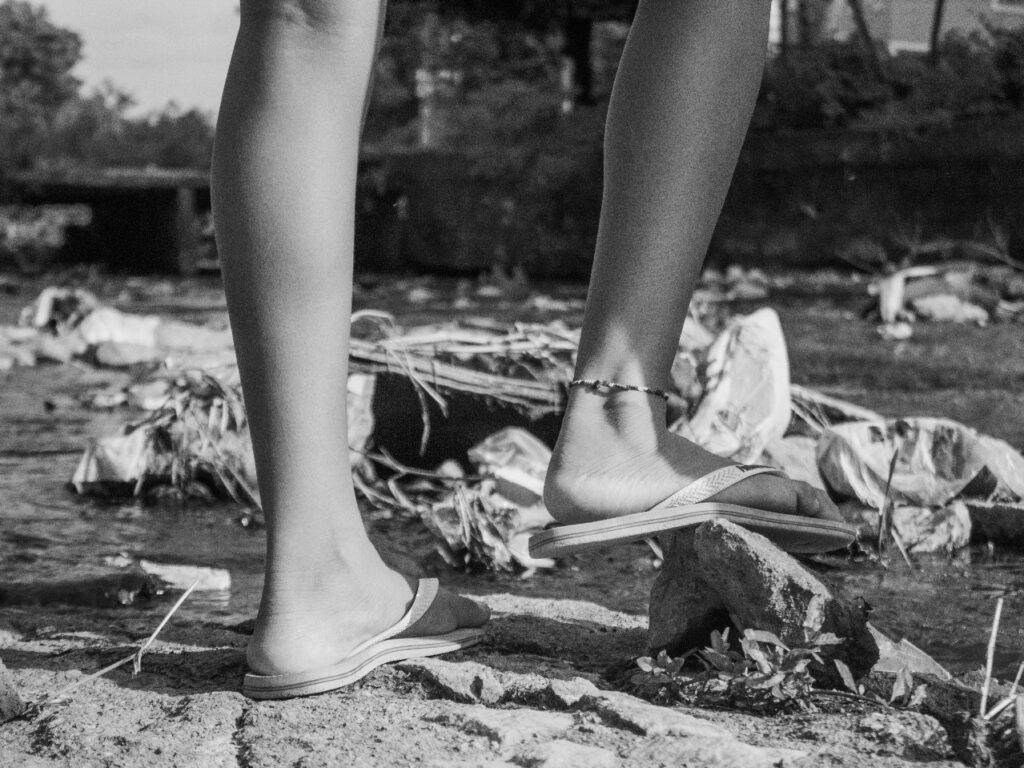 Uma menina finca o pé sobre a pedra como quem desafia o esquecimento. Mesmo cercada pela poluição, seu gesto afirma: estamos aqui, ainda vivos, ainda lutando. © Inaiê/Rede Reaver.